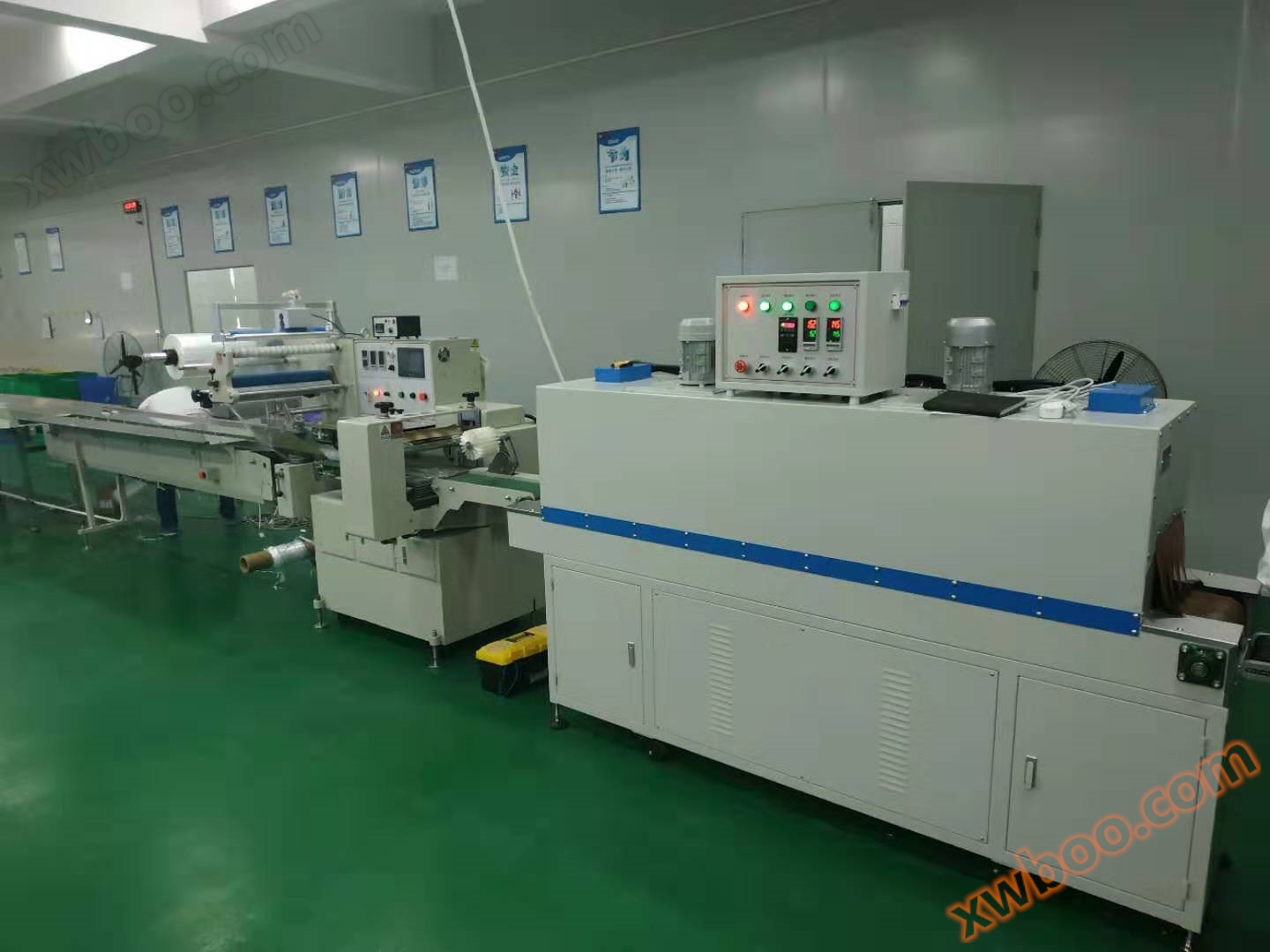 2. la longitud total de la máquina de embalaje más el horno de contracción es7.4Metros, se puede alargar el cinta transportadora de acuerdo con los requisitos del cliente.
